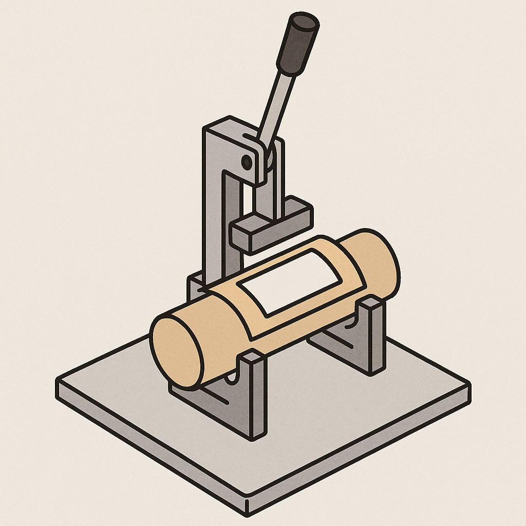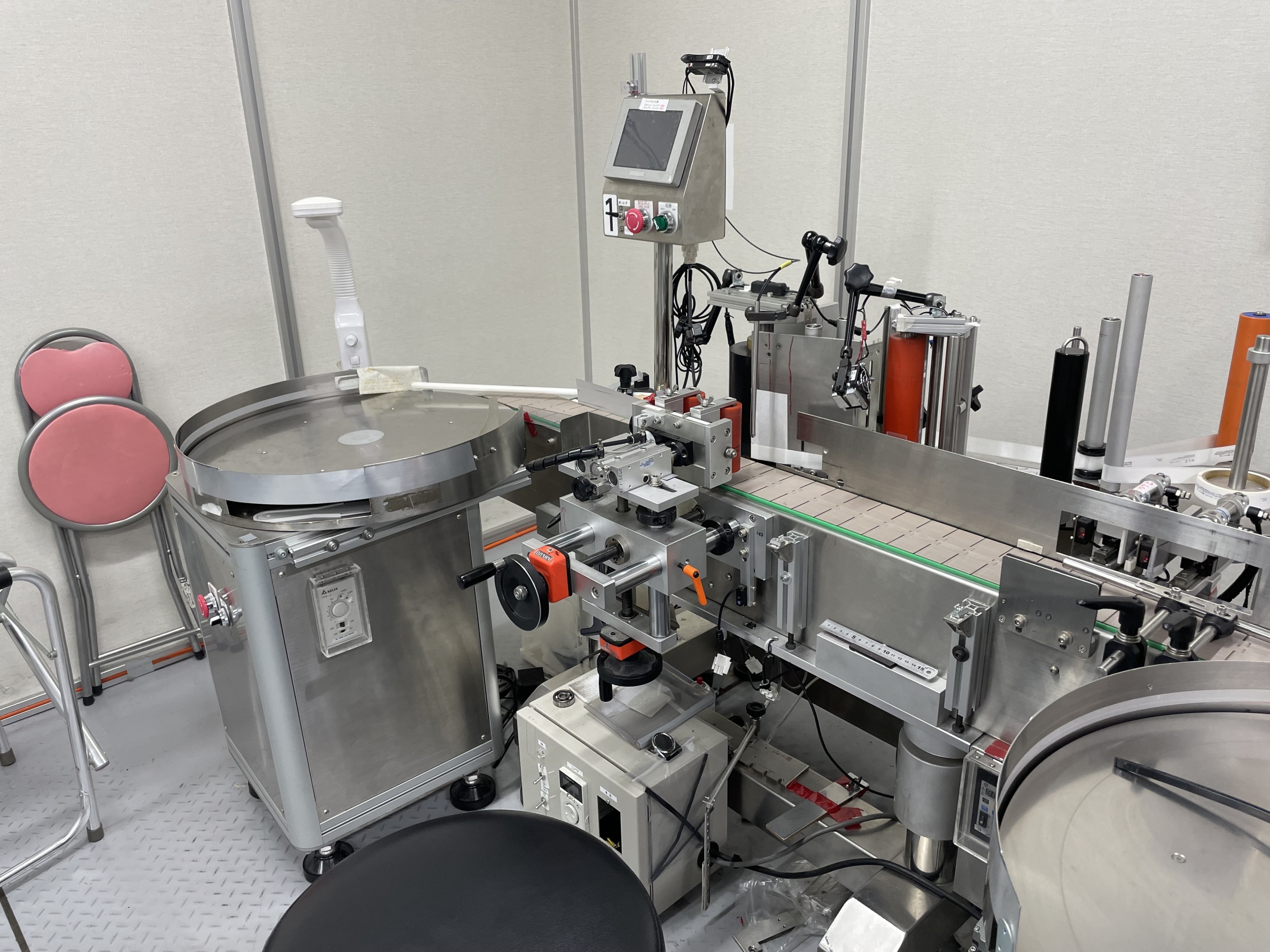 容器の形状が原因で機械貼りが出来ない場合は治具を作って、
